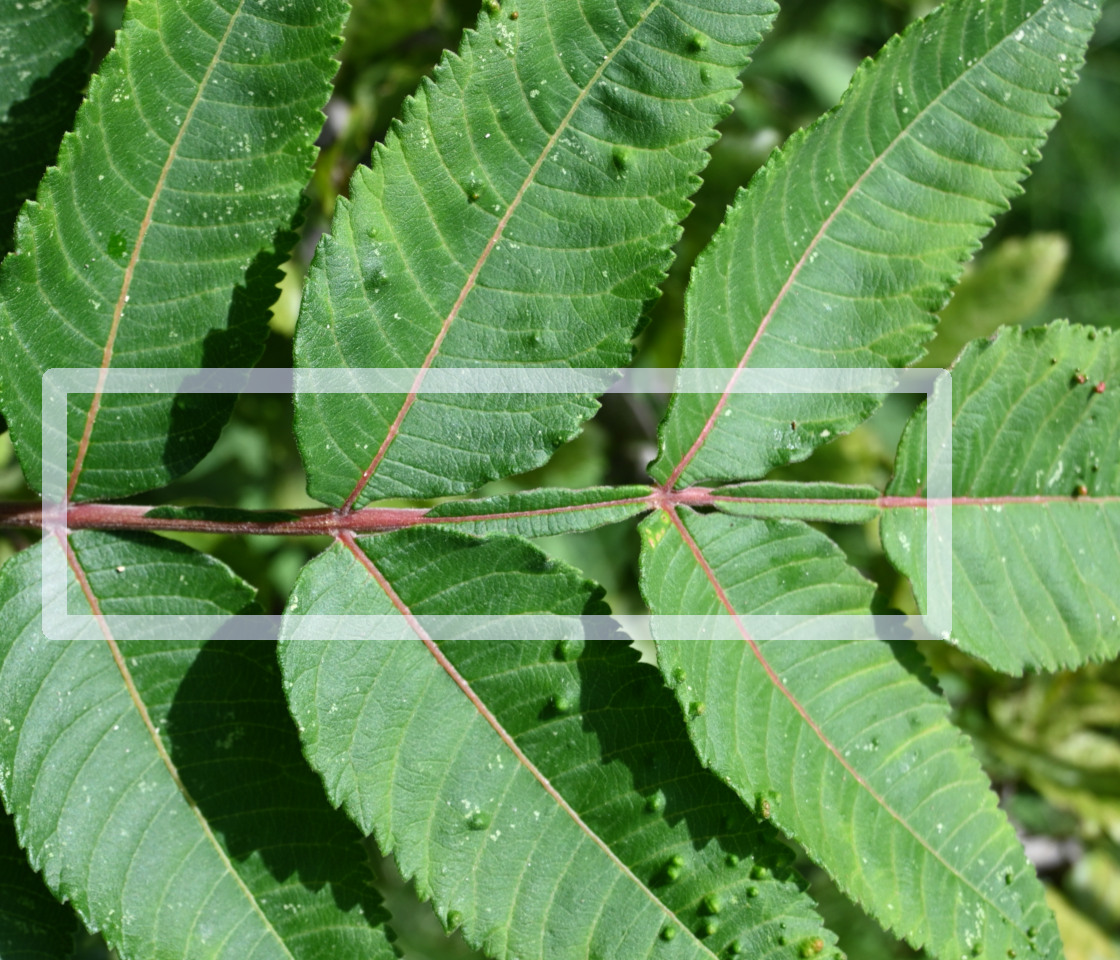 しばしば葉に大きな膨らみができますが、これはヌルデシロアブラムシの寄生によって形成される虫癭(ちゅうえい、虫こぶ)で、五倍子(ごばいし、ふし)と呼ばれています。