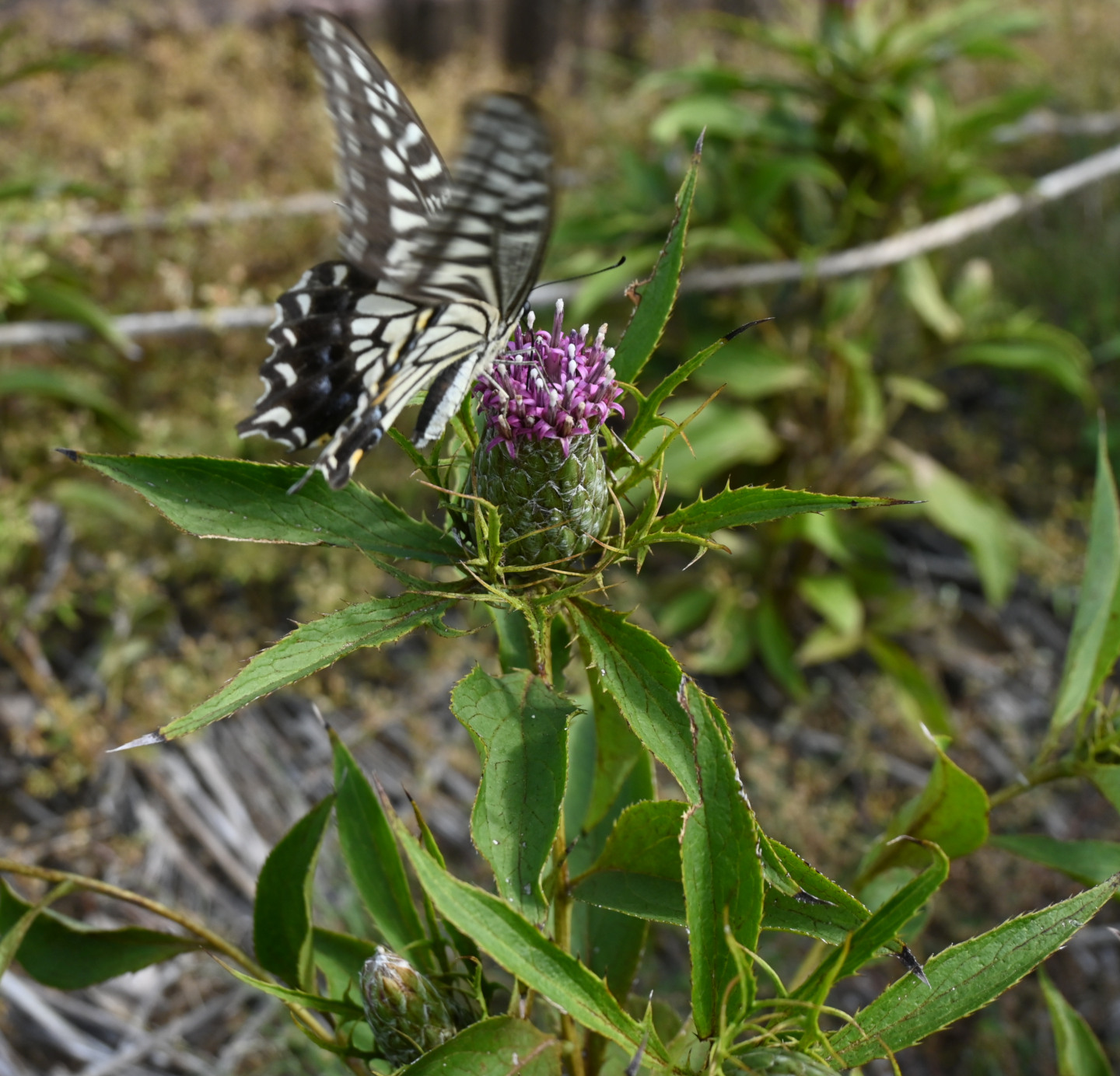 オオバナオケラは、名のとおり頭状花序が大きく、オケラの倍ほどあって直径3-4cmに達し、色は紅紫色です。昆虫の訪花も多く、この画像ではナミアゲハが吸蜜に訪れています。