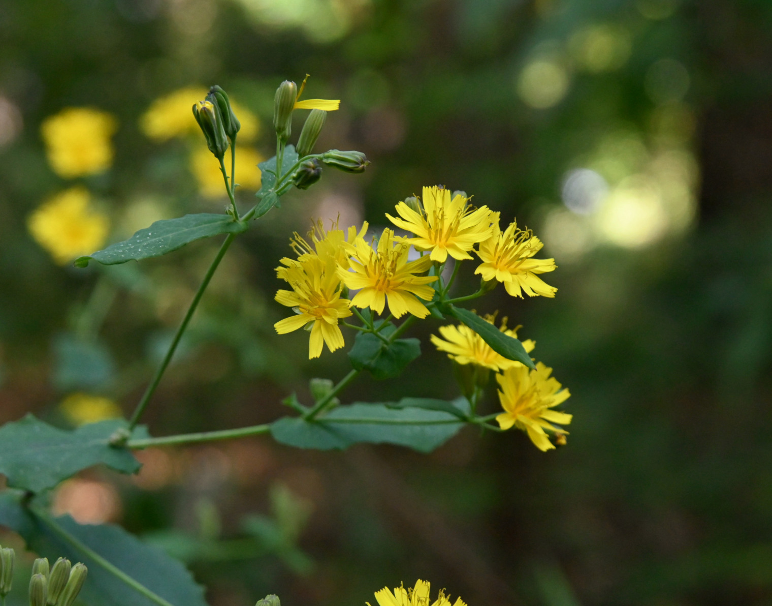 里山や山地の乾いた場所に多く生育する二年草(春に発芽し、1回越冬し、翌年秋に開花して枯れる)で、30cmから、1mほどの高さに達します。 和名の由来は葉の形が薬師如来の光背に似ているから、などの諸説があります。 舌状花のみからなる、直径1.5cmほどの頭花を多数咲かせ、群生するとみごとです。 花は、晴天の日によく開き、曇雨天の日は半開きの姿となります。 【分布】北海道~九州、朝鮮半島、中国、ベトナム