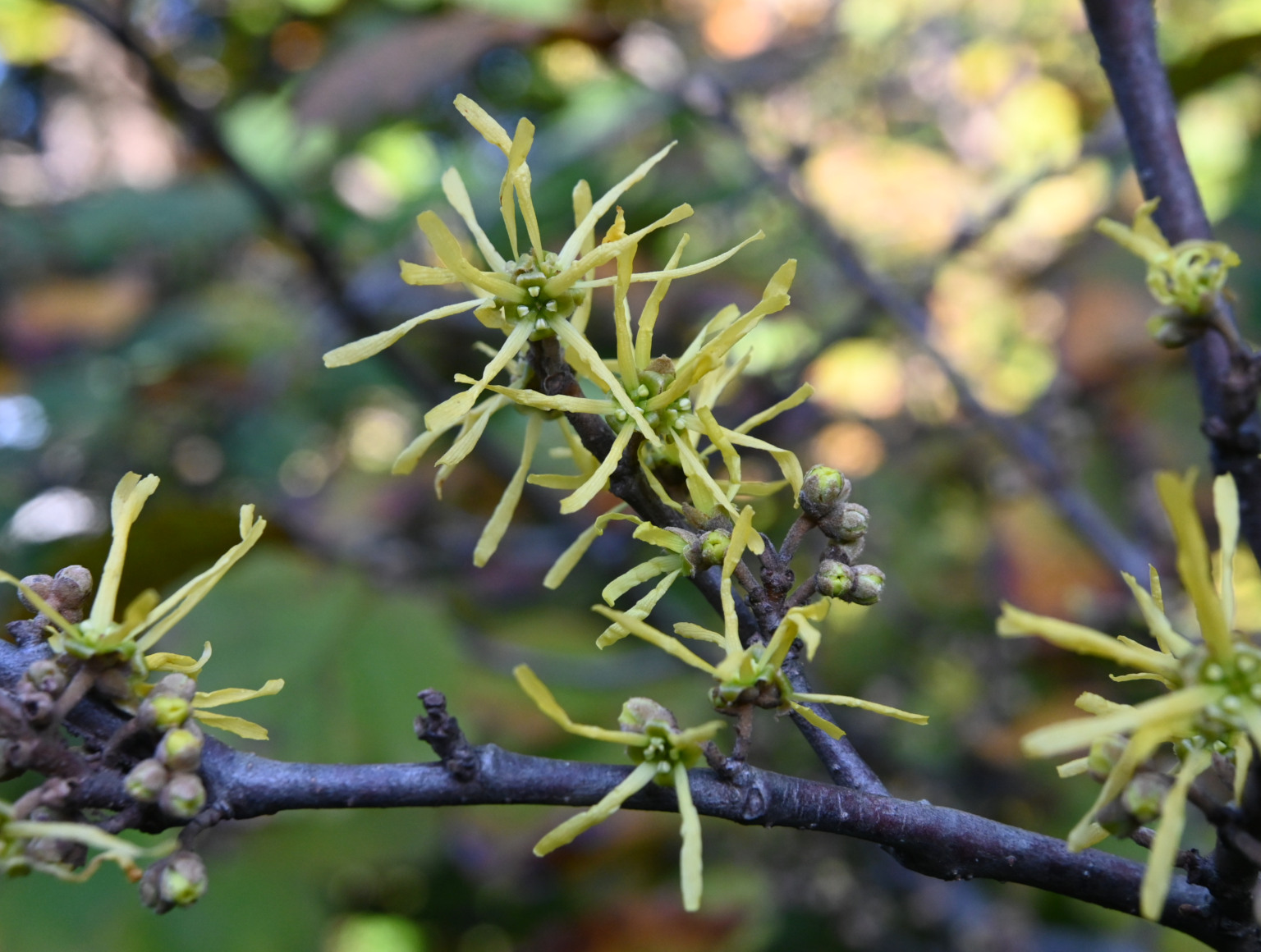 北アメリカ原産の落葉高木です。わが国のマンサクやシナマンサクは早春に開花しますが、本種は冬が来る前、晩秋に咲きます。 葉や樹皮にタンニン等を含み、収斂作用が知られます。アメリカ先住民が外傷などに民間薬としてきた植物で、現在は、属名の「ハマメリス」の名で、抽出したエキスが市販の化粧水などに用いられています。