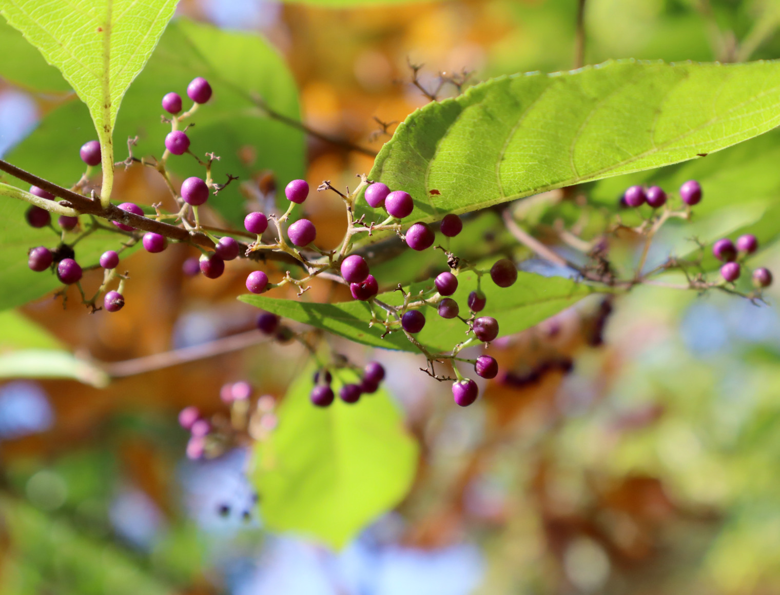 なお、ムラサキシキブ(紫式部)の名称で流通・販売されている、果実がたわわに実る株立状の灌木は、コムラサキという別種で、自然では湿地にまれにみられるものです(ロックガーデンにありますが、見頃は既に終わっています)。ムラサキシキブはコムラサキに比べて果実が疎らで、派手さがありませんが、楚々として野趣のある樹木です。