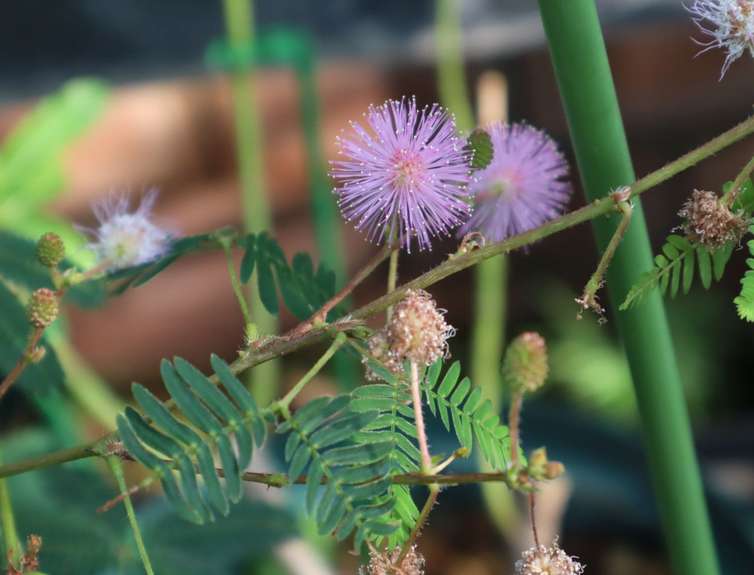 2回偶数羽状の細かな複葉や、雄しべが目立つ「くす玉」状の花序などは、ネムノキやフサアカシア(一般にミモザと呼ばれるもの)などと共通であり、マメ科の中でもこれらをネムノキ亜科(オジギソウ亜科)にまとめています。