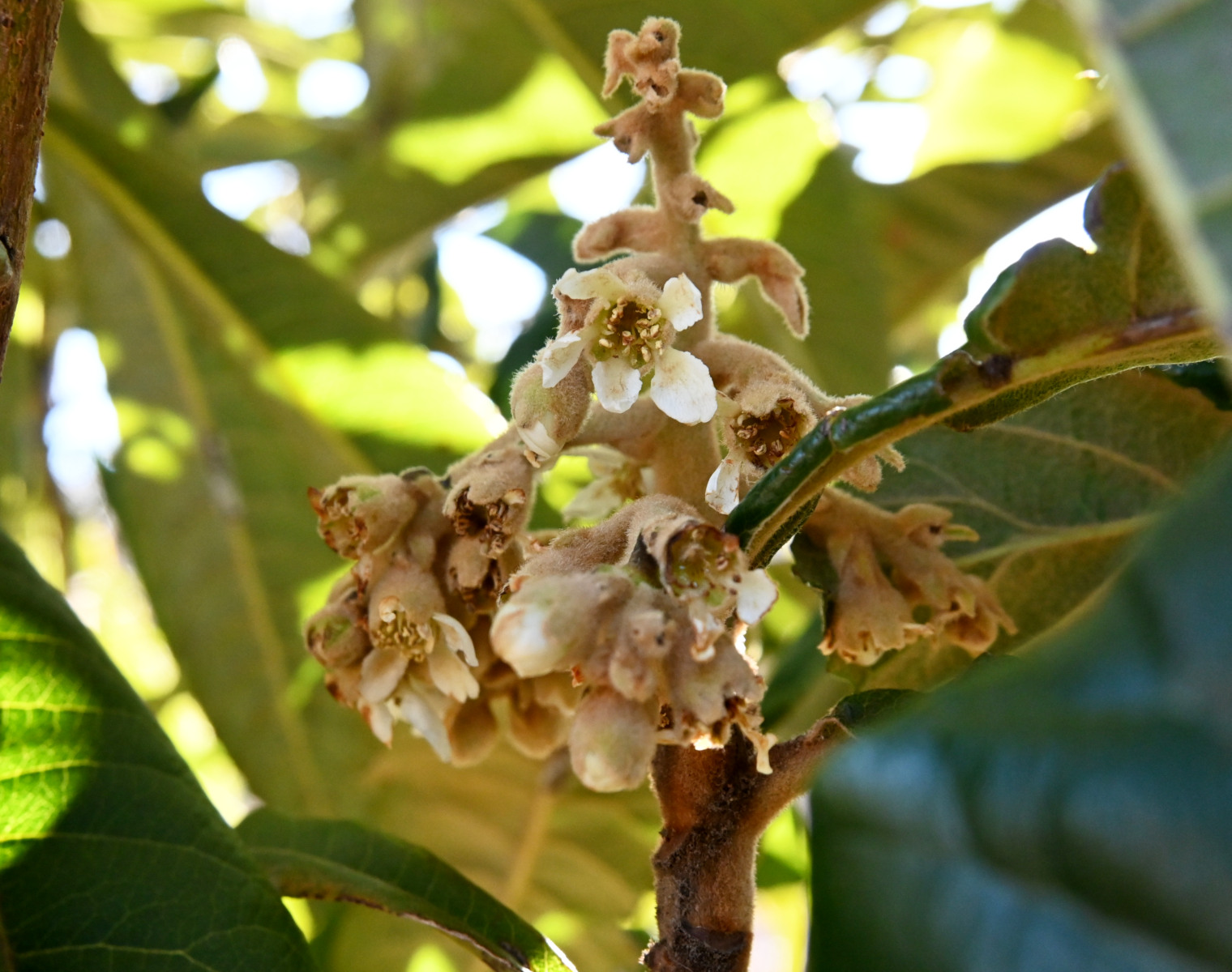 花は晩秋から真冬、翌年早春にかけての寒い時期に咲きます。モモ、リンゴ、アンズなど、他の多くのバラ科果樹類とは対照的に、ビワの花は小さく地味で、開花が話題となることは稀ですが、甘くさわやかな芳香をもち、冬も活動する昆虫や鳥類の貴重な蜜源となっています。