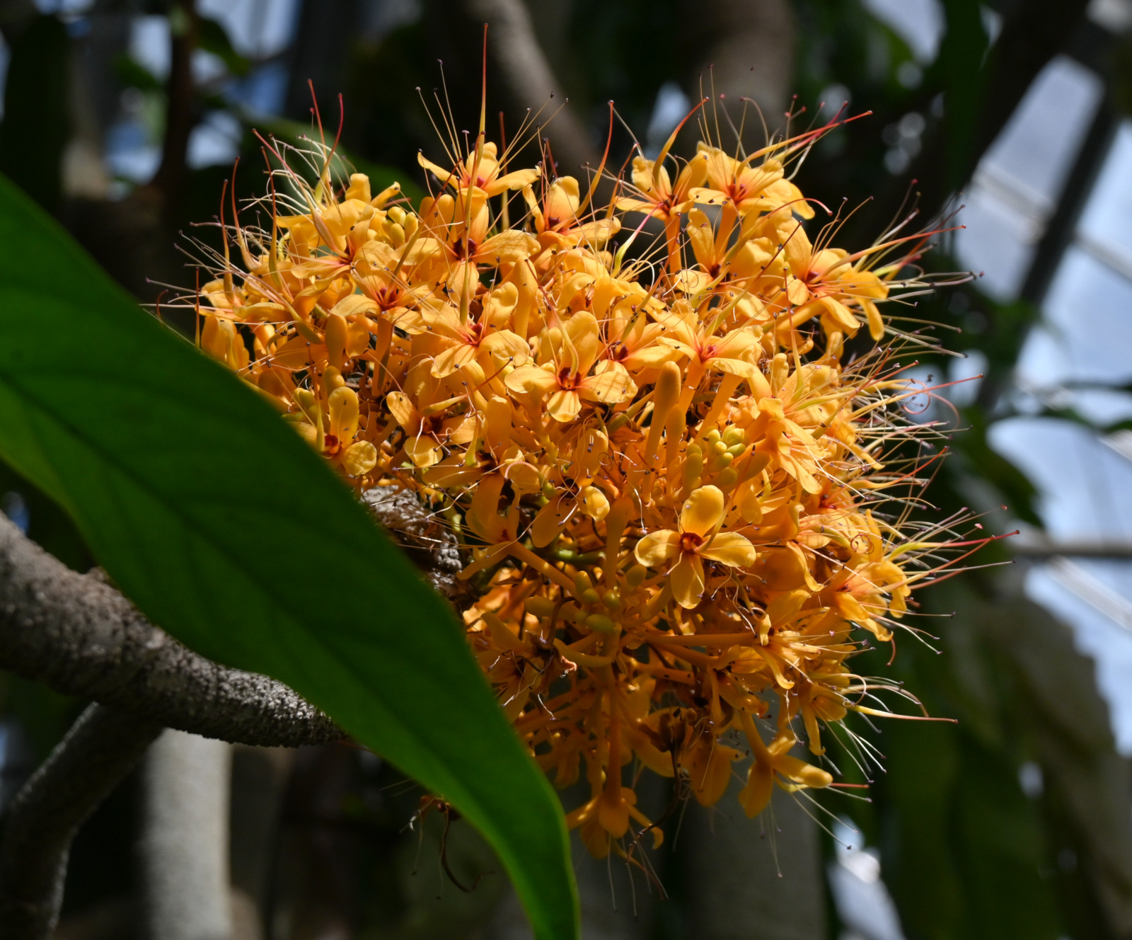 花序の数が少なめではありますが、明るい色合いのムユウジュの花が温室でみられます。