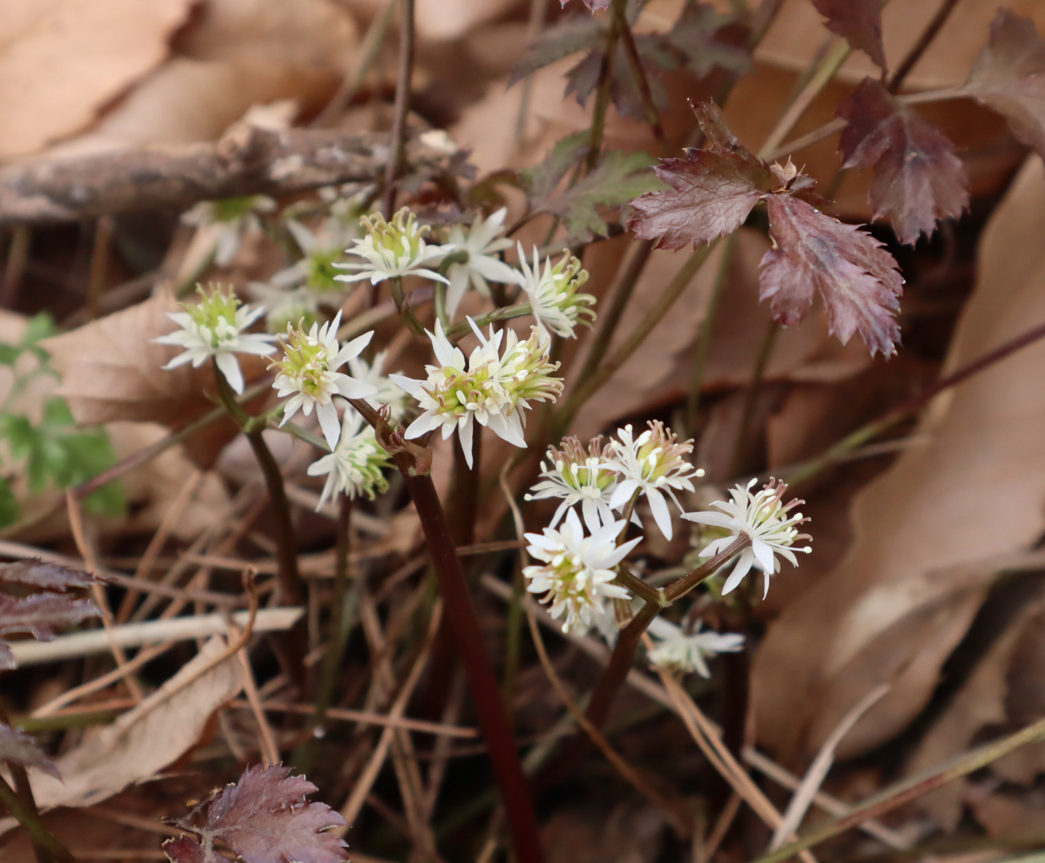 オウレン Coptis japonica は日本特産種の常緑多年草です。複葉の分かれ方の程度によって、キクバオウレン、セリバオウレン、コセリバオウレンの3変種に分類されます。