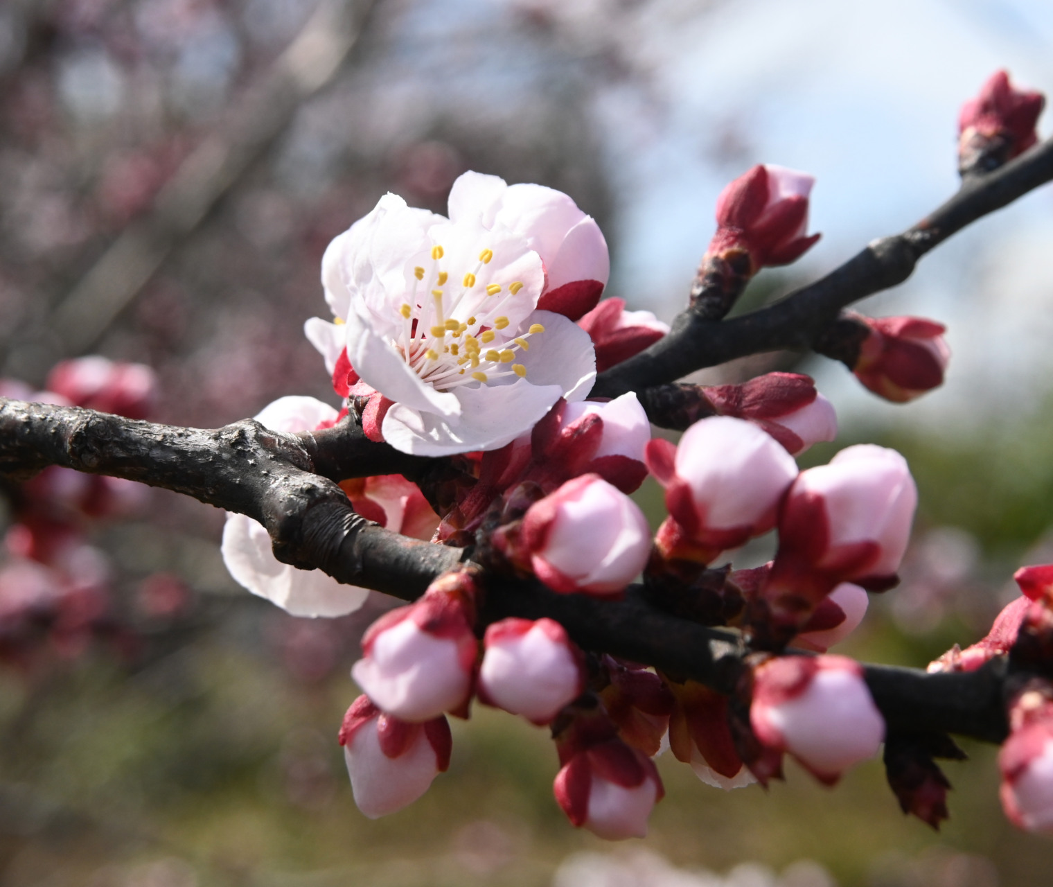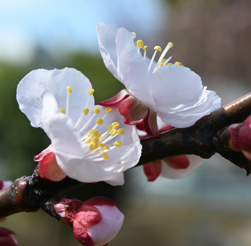 アンズの花もウメに似ていますが、香りがほとんどありません。また、開花した花の萼片が後方へ反り返る性質は、ウメにはみられないアンズ特有のものです。