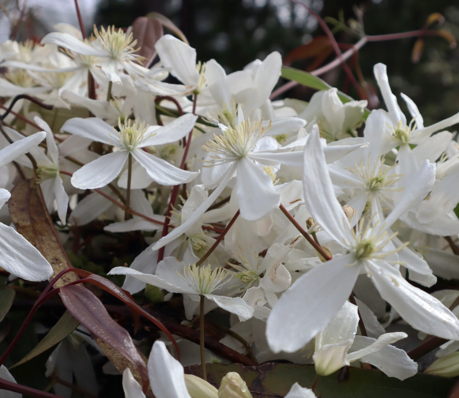 花弁のようにみえる萼片は4〜6枚あり、花にはほのかな芳香があります。耐寒性が強く、育てやすいクレマチスとして、しばしば植栽されます。