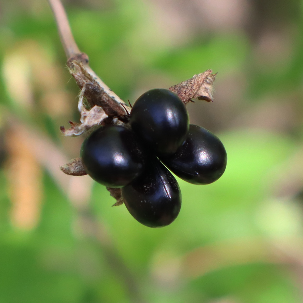 果実は4個ずつ着果し、ヤマブキの果実よりも大きく、晩秋に光沢のある黒色に熟し、一部は今の時期にも残存しています。発芽率は良好で、当園の林地では実生苗が育って、個体数は増加傾向にあります。