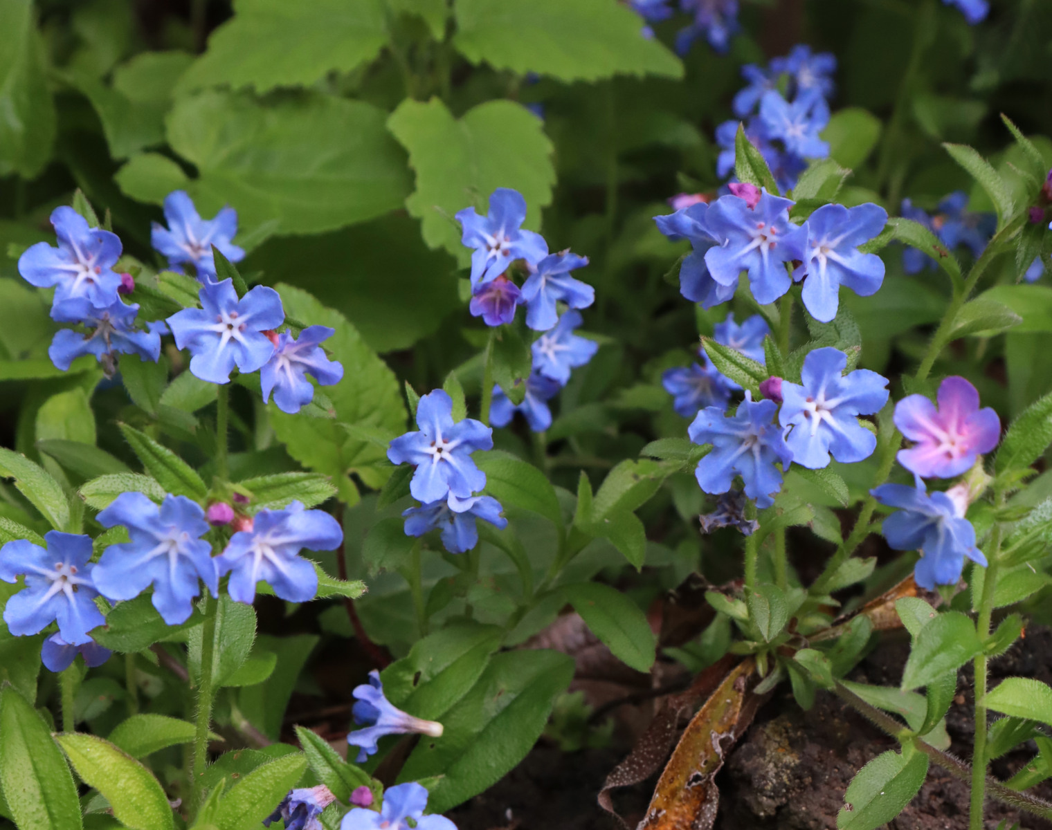 丘陵地や山地に生育する、背の低い、匍匐性の多年草です。 林縁などの半日陰地で咲く花は、青光りするホタルを想起させます。 開花直後の短時間は赤紫色で、その後コバルトブルーへと変化します。 花のあと、横に伸びる匍匐茎を伸ばして、翌年の開花苗を形成します。 【分布】北海道から九州