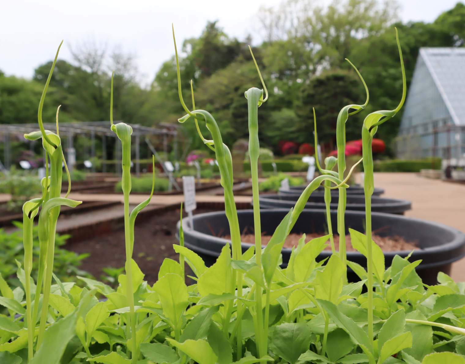 近縁種に、全体が大型で珠芽をつくらないオオハンゲがあり、こちらは園内林地などで見ることができます。なおオオハンゲは、生薬ハンゲの基原植物として収載されておりません。